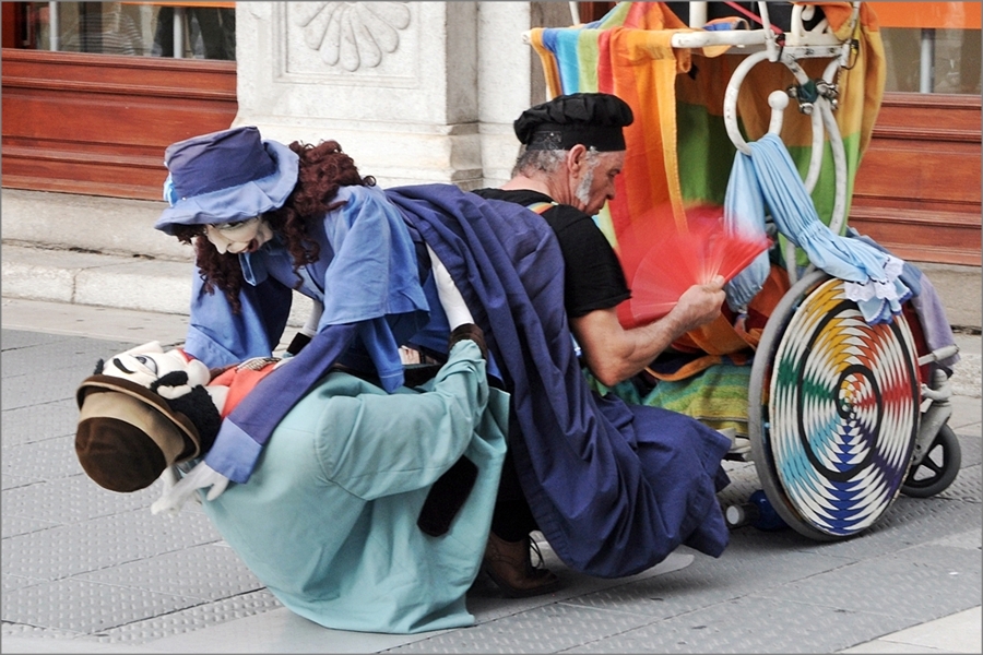 Si Giovannino un artista di strada che eseguiva uno spettacolo divertente ma faticosissimo (posterò anche una foto in azione).Tra una esibizione e l'altra si riposava facendosi vento con il ventaglio.Proprio per evidenziare questo movimento avevo impostato 1/30 che con la focale di circa 60mm su mezzo formato e scatto a mano libera ha indotto il micromosso.Ti ringrazio tantissimo per il tuo graditissimo commento.Ciao,Sergio. Smile
