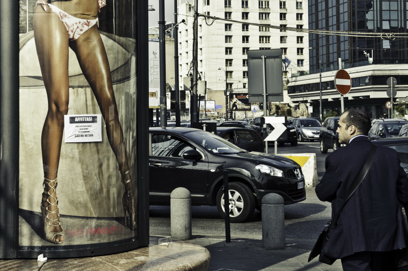| Io invece la preferisco in B/N, parere personale, s'intende  . Il nostro modello di lettura di un'immagine è di stampo occidentale, andiamo da sinistra a destra (nella maggior parte dei casi): ritrovare pertanto quel rosso,  unico nella scena, in quella determinata porzione del fotogramma ancora il mio sguardo. Per questo disturba, non tanto perché  è un elemento di un contesto - purtroppo, ma non potevi fare altrimenti - caotico, ma perché rappresenta un catalizzatore dell'attenzione. Altro aspetto: la conversione accentua e quindi mette in risalto,  il bianco del costume della ragazza dell'insegna e del volantino sottostante, che sono i protagonisti del tuo racconto insieme all'uomo. _________________