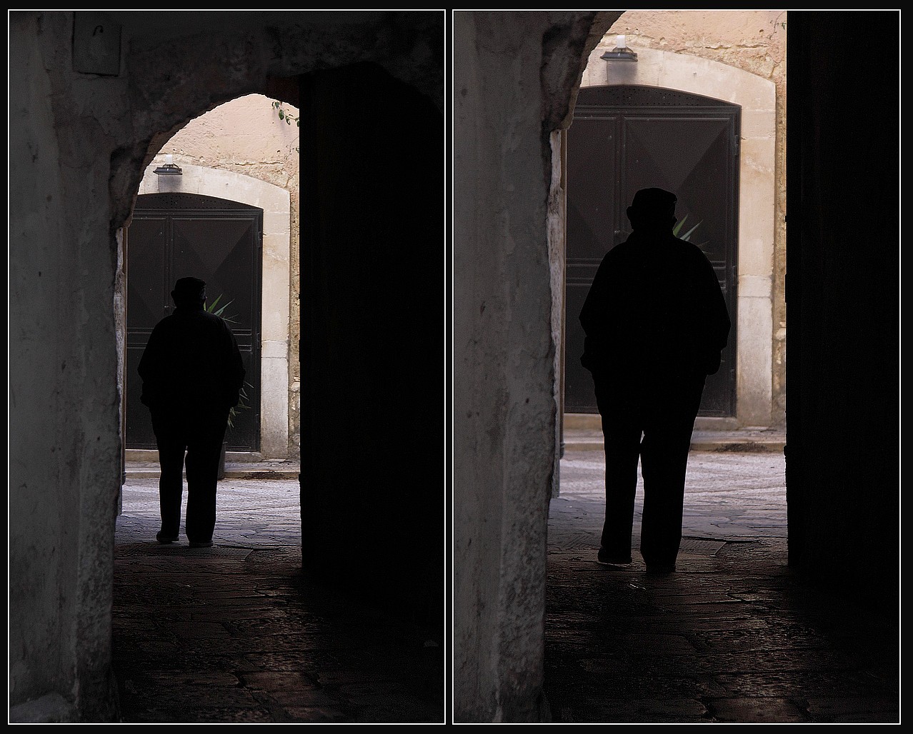 Le due pose sono effettivamente molto simili in quanto scattate in sequenza rapidissima, rapidissima per evitare che il signore...svanisse svoltando in fondo al breve vicolo.