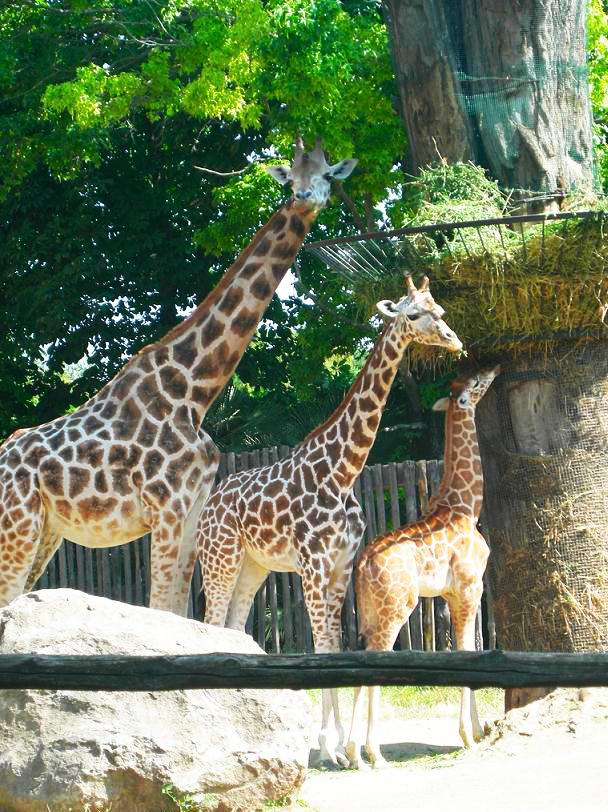 Questa fa parte delle fotografie fatte "al volo", senza nemmeno guardare le impostazioni della macchina per non perdere l'attimo. Il mio atteggiamento di fronte a queste immagini è sempre stato quello di tralasciare il più possibile gli errori tecnici (in questo caso le alte luci bruciate, per esempio) e di concentrarmi solo sulla scena còlta, che è poi il vero motivo per cui il fotografo ha scattato. In questo caso secondo me hai fatto benissimo a non perdere la posa delle tre giraffe, che sembrano davvero lo stesso animale in tre fasi della vita differenti.