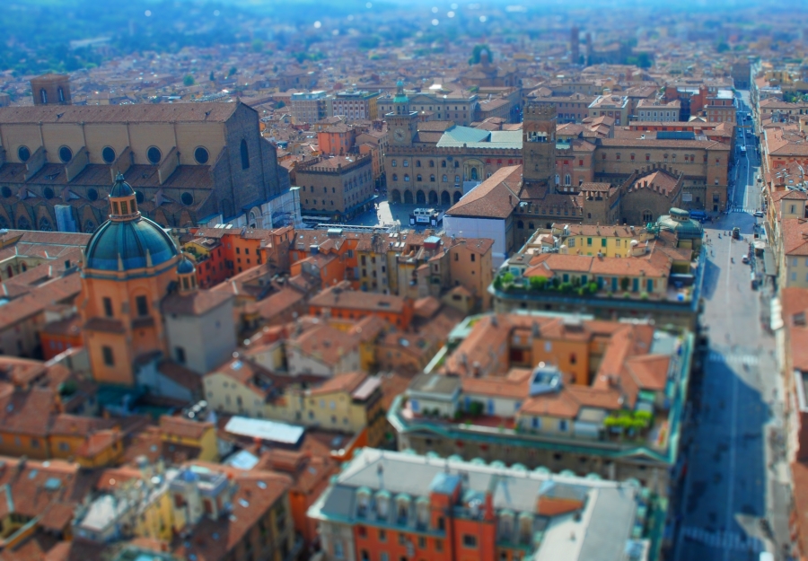 Effetto modellino che trasforma Bologna dall'alto in un quasi gioco di costruzioni. Tinte molto sature, magari da moderare un poco, prevalentemente nel canale del blu.