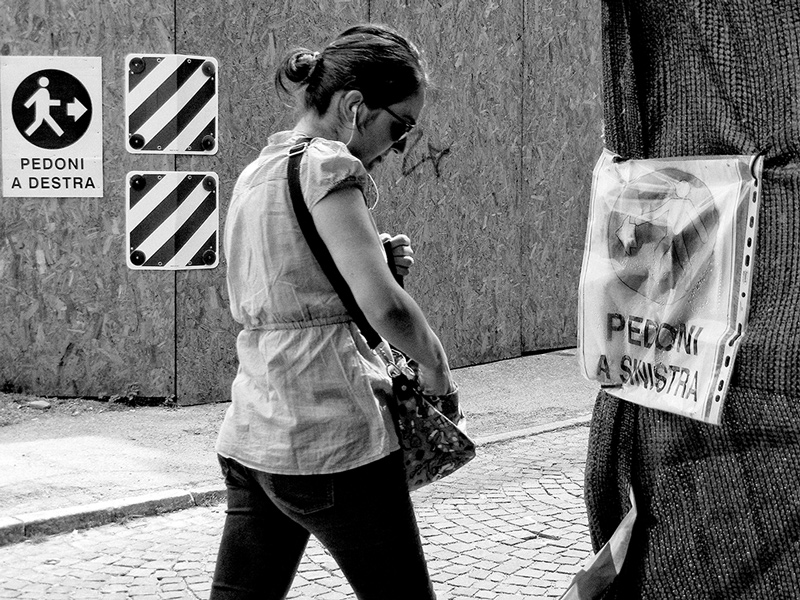 Una scena direi all'italiana. Cartelli che danno indicazioni non facili da interpretare e passante immerso nelle cuffie che non prende in considerazione i pericoli. Buono il bn a mio avviso.  _________________ Ciao
