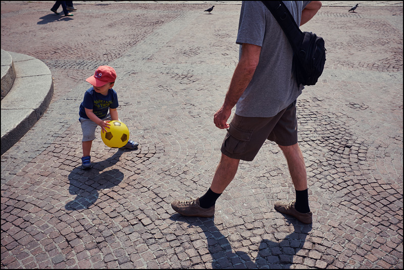 Conoscendo la tua galleria mi riesce difficile pensare ad uno scatto un po' casuale.Il bambino(molto bella la posa)sembra essere attratto da qualcosa tanto da bloccare la palla ed interrompere il gioco.Interessante anche il rapporto dimensionale tra i diversi soggetti e la composizione che spinge il nostro occhio ad attraversare in diagonale il fotogramma,partendo da destra in basso,per poi costeggiare il lato superiore.In questo viaggio visivo ci imbattiamo più volte nella dualità:gambe,persone,piccioni.Forse questa è la chiave di lettura.Un forte saluto,Sergio. Smile