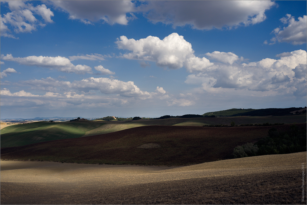 Tu puoi permetterti di far convivere una parte inferiore tutta giocata su ombrose cupezze, su passaggi forti di luce ed ombre, in scivolamento sull'ondeggiare lieve del terreno, su mille sfumature di beige, e per contraltare poi riprendere il più limpido ed azzurro dei cieli, nelle semplicità di una folla di nuvole leggere. Quando dialoghi con il paesaggio sai sempre farlo con al giusta dose di forza e di dolcezza.