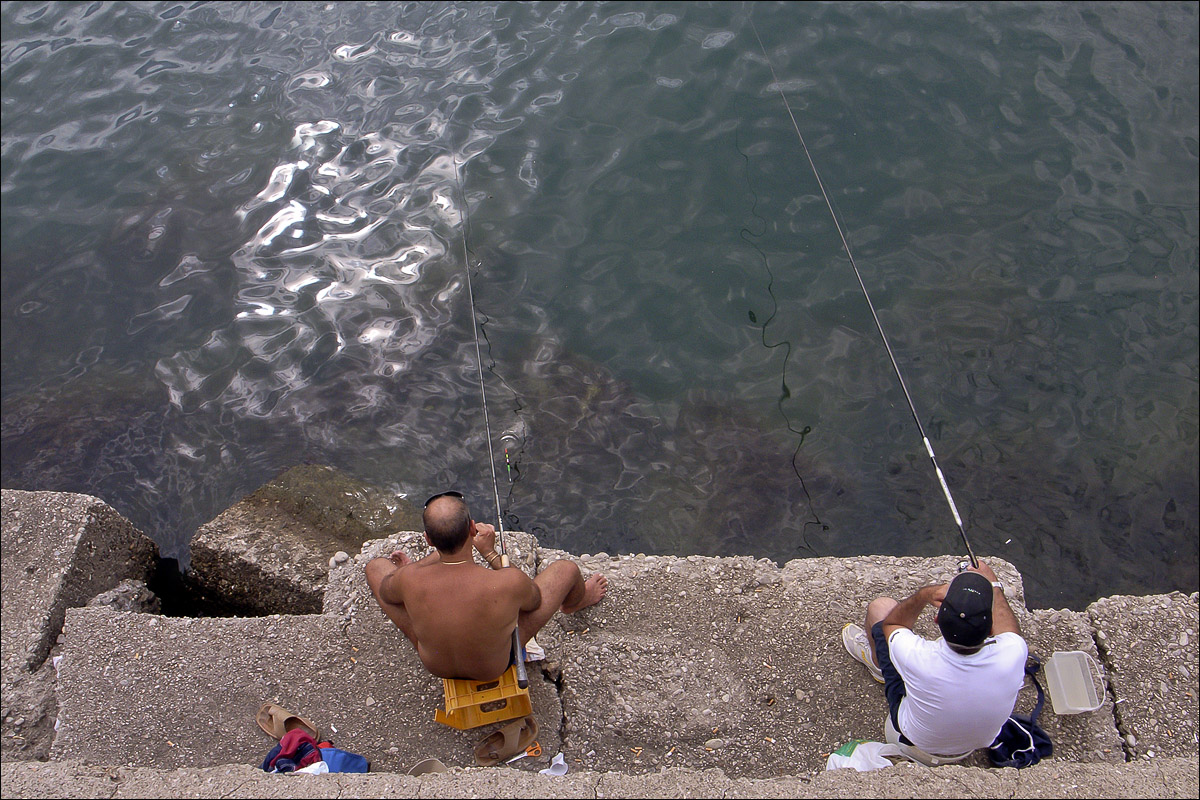 Mi piace questa ripresa dall'alto dei due ignari pescatori rilassati e immersi nella loro passione. Belli i riflessi sull'acqua. Una leggera dominante magenta risolvibile....  |
