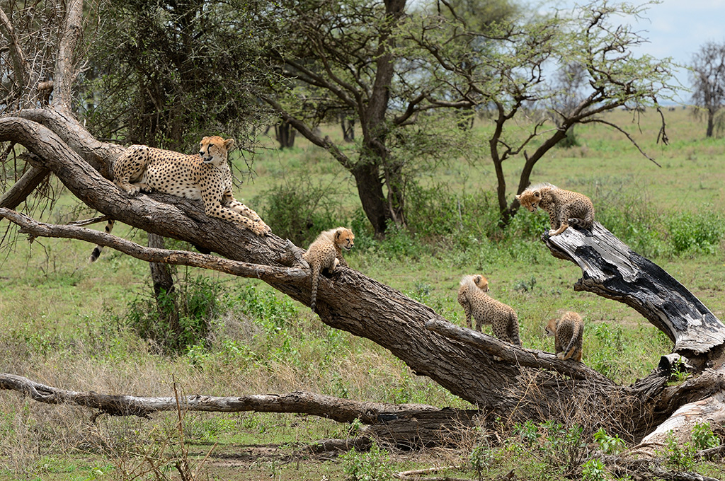 un momento di relax di questa bella famiglia di ghepardi in cui i cuccioli sembrano davvero spensierati e la mamma che con tutta la sua maestosità dal punto più alto sorveglia l'ambiente circostante