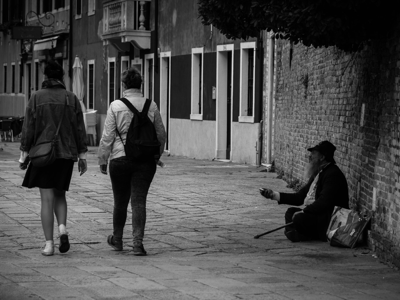 Lo sguardo del mendicante conduce verso i passanti così chi osserva può scorrere in tutta la foto.