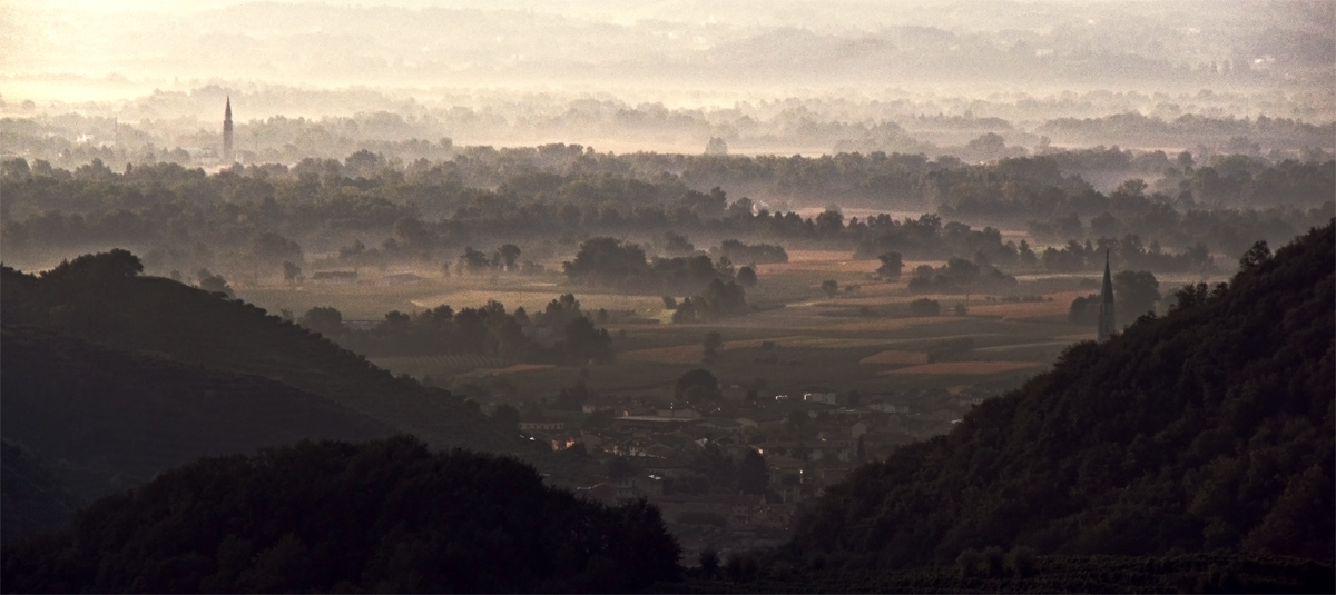 La ''V'' disegnata dalle alture sembra una quinta scenografica che ci fa pian piano scoprire un magnifico mondo nascosto e ammantato da una dolce nebbiolina.