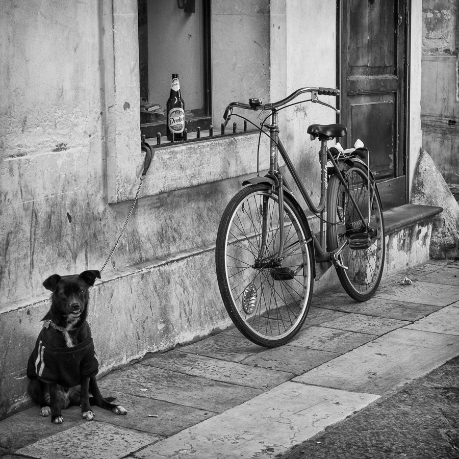 molto presente la figura del padrone anche se non si vede. l'attesa speranzosa del fedele cagnolino, la bicicletta, il guinzaglio, sono elementi riconducibili ad un padrone che si aggira nei paraggi. uscirà barcollando ma il cane lo ricondurrà a casa sano e salvo...che bel racconto che m'è venuto in mente ! foto che racconta, foto riuscita  |