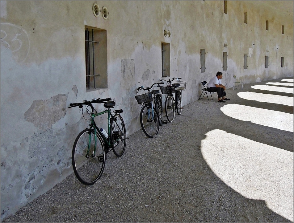 Il tipo seduto non mi sembra abbia molta voglia di pedalare  |
