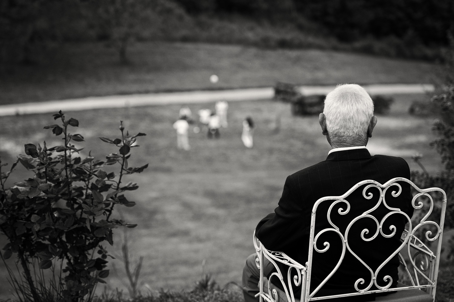 anche se fortemente sfocata è evidente la nuova generazione che gioca spensieratamente a palla. lui no, non è spensierato. è seppellito di ricordi belli e brutti.