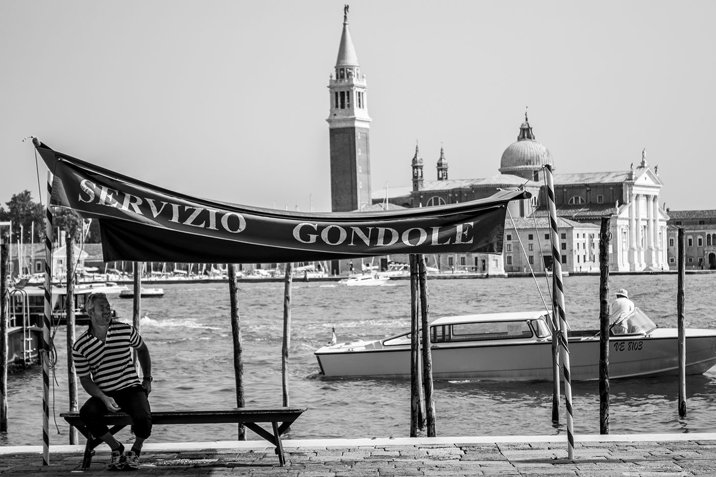 Se vogliamo andare oltre con il "racconto fotografico", potremmo commentare che un servizio gondole senza gondole è un po' strano, a meno di volerlo evidenziare apposta, facendo leva sull'ironia. In questo caso però allora meglio sarebbe stato aspettare che il motoscafo fosse andato via, in modo che lo spazio d'acqua davanti fosse sgombro. In questo modo la mancanza di gondole sarebbe stata più evidente.