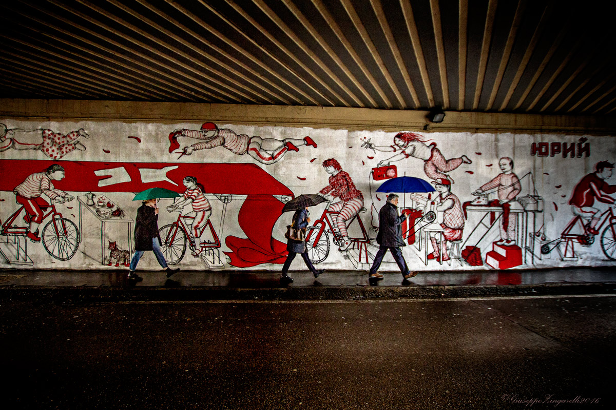un tris di gambe a forbice, un fondale piacevole da osservare, esilarante poi vederli tutti tre con l'ombrello aperto in un luogo coperto, ottimo il colpo d'occhio..e secondo me, valeva la pena di tagliarla un po' (sotto e a destra) per rendere la scena meno dispersiva.