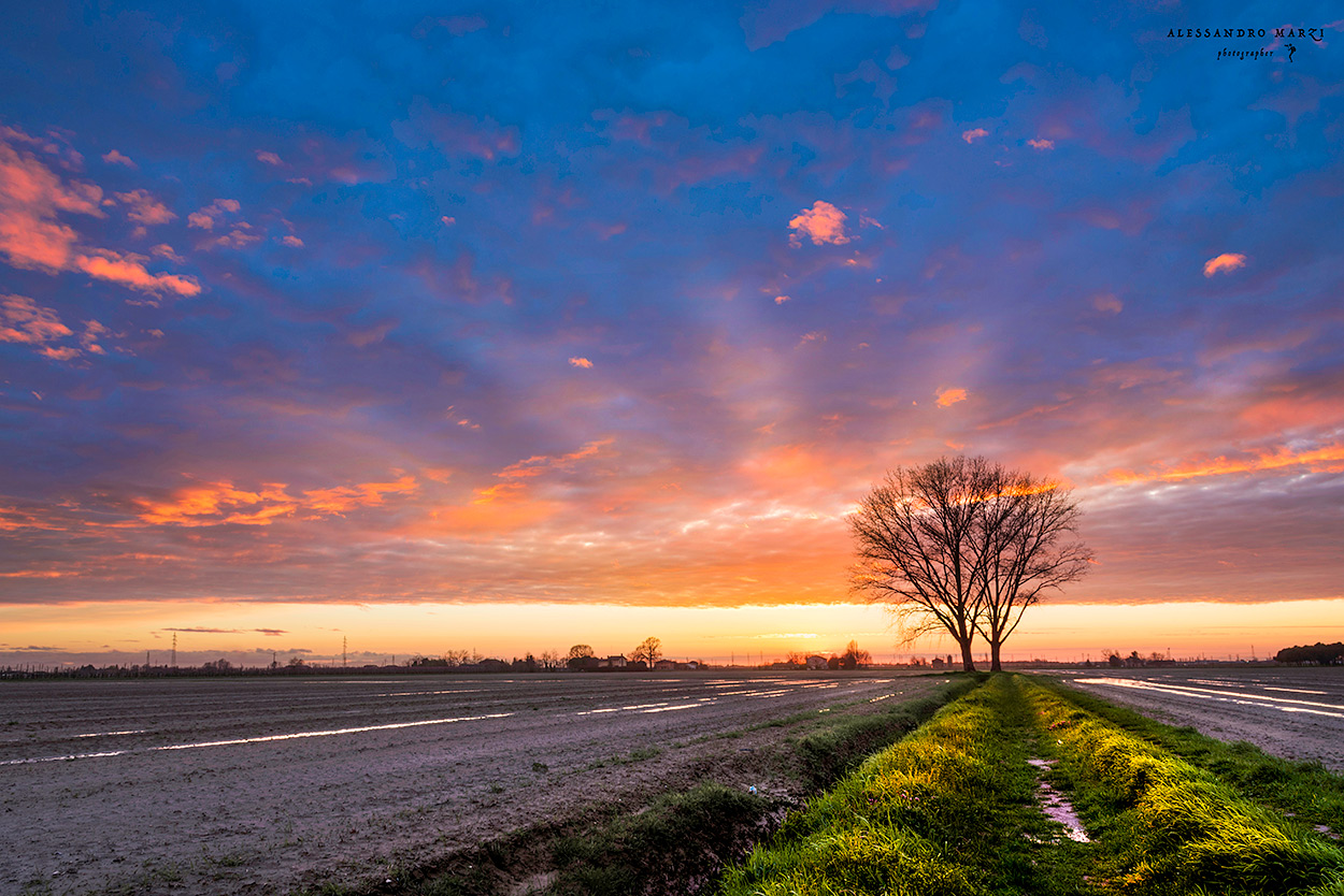 I "nostri" alberi gemelli, che da bravi ravennati spesso passiamo a ritrarre entro i nostri paesaggi. Premetto che fai bene a sperimentare e questa tua foto non é certamente né brutta né inutile; però , anche se la seconda versione é migliorata, resta un quadro dalle tinte molto cariche. Il tono del cielo lo prenderei volentieri a prestito per un bell'inchiostro da stilografica, ma lo trovò troppo lontano dalla realtà certamente più delicata. La guardo con interesse ma con riserva.
