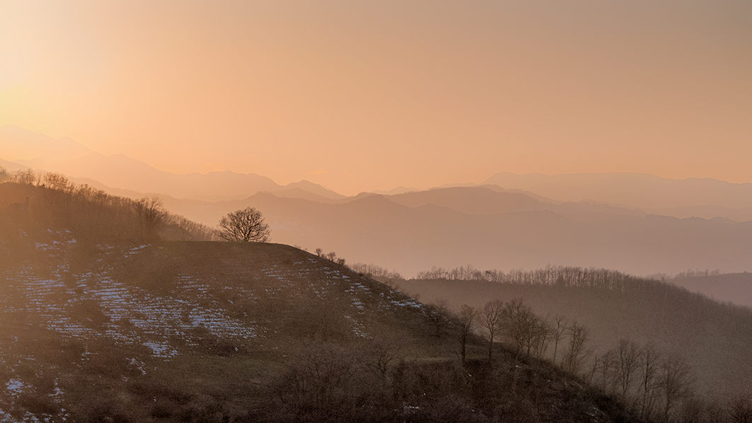 Davvero delicata e ben distribuita anche compositivamente, questa ultima neve che spolvera le colline al tramonto.