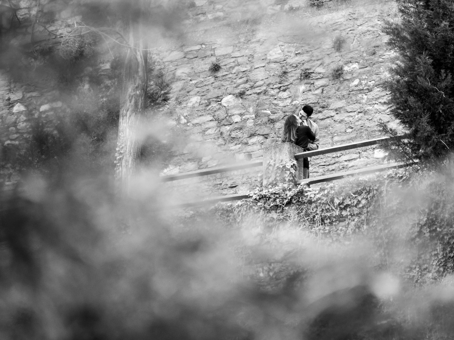 Un varco, una cornice naturale sfumata e un tocco leggero di voyeurismo che guida lo sguardo verso una coppia che si lascia andare in un gesto di amore. Non serve altro a questa immagine