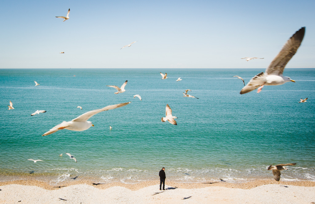 a me piace un sacco. composizione, scena, esposizione. quei gabbiani alcuni con un bel mosso dinamico sopra un mare bello azzurro e la figura umana centrale ai piedi del fotogramma che fa da ciliegina sulla torta.  |