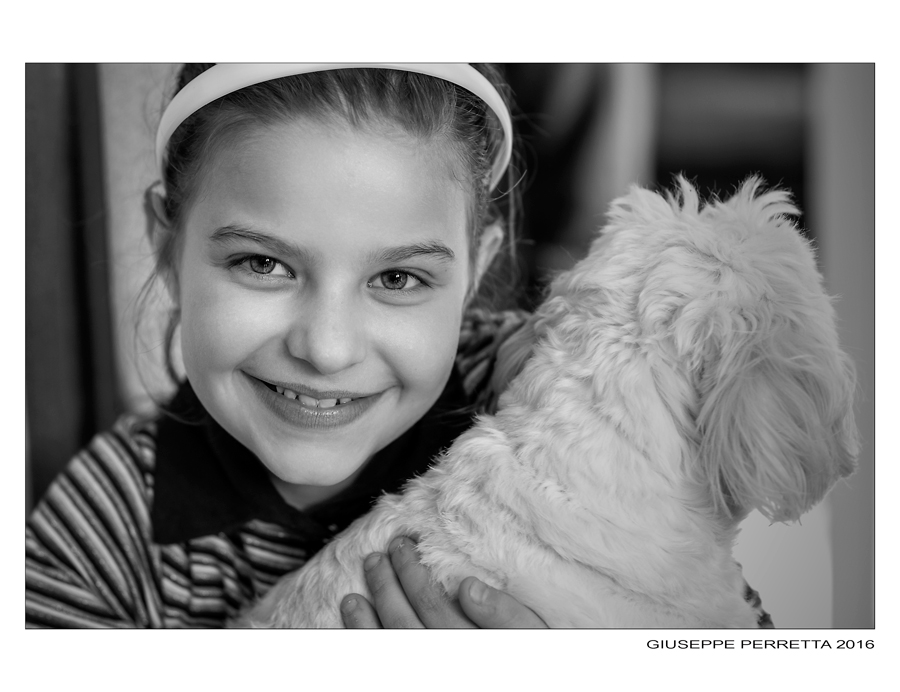 Un ritratto più che buono ed il taglio superiore forse poteva essere gestito diversamente ma non penalizza troppo la foto ( e si comprendono perfettamente le problematiche date dal cucciolo in bianco!) Il volto della signorina è ciò che hai restituito ovviamente al meglio, come espressività e dolcezza.