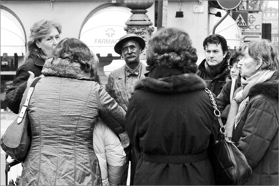 Grazie Max per il graditissimo commento e le osservazioni.Si la signora penso sia una guida turistica che illustra la figura di Joyce ad un gruppo di turiste.Ma è lui il centro dell'interesse. Ciao
