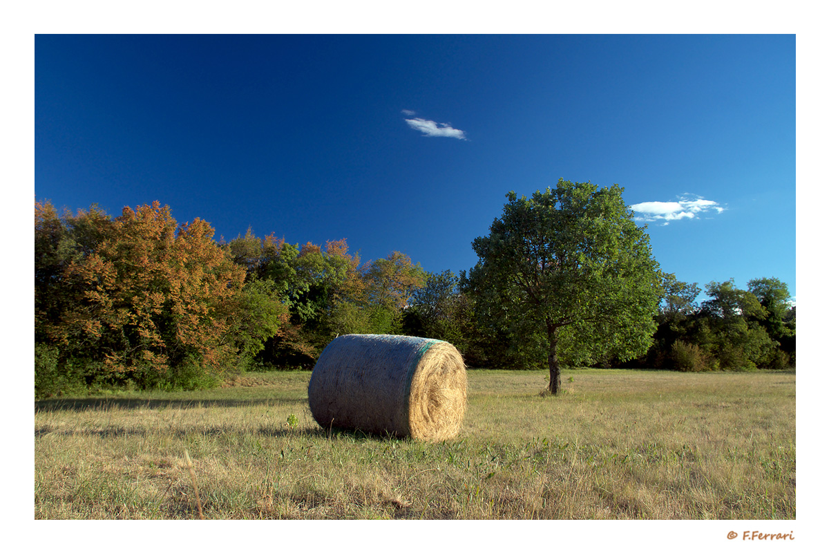 Grazie Cristian delle osservazioni. Naturalmente ho tentato di isolare una composizione da un paesaggio più vasto. Ciò che mi ha convinto per questo PDR sono le condizioni di luce (avevo su il polarizzatore e l'inclinazione del sole in questa inquadratura faceva si che che il cielo venisse fuori di un bel blu carico), le nuvolette bianche a spezzare la monotonia del cielo, l'albero sul terzo stando attento che non impallasse le nuvole, la rotoballa protagonista che dialoga con l'alberello, la tonalità più calda del cespuglio su fondo a sinistra. Insomma la composizione mi intrigava parecchio... Provo ad allegare una versione dello stesso scatto in rapporto 1:1 tra i lati, ma così mi si taglia l'ombra della rotoballa e il cespuglio marroncino...per quanto riguarda le righe azzurrine della rotoballa, quelle fanno parte della rete usata per compattare il fieno in quella forma, non credo avrei potuto toglierle, a scapito di non avere più una rotoballa da fotografare... Very Happy