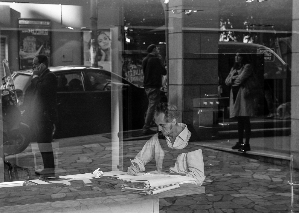 Se anche la signora a destra avesse avuto un cell all'orecchio ... comunque un soggetto assorto tra le sue carte, le comparse che transitano incuranti.