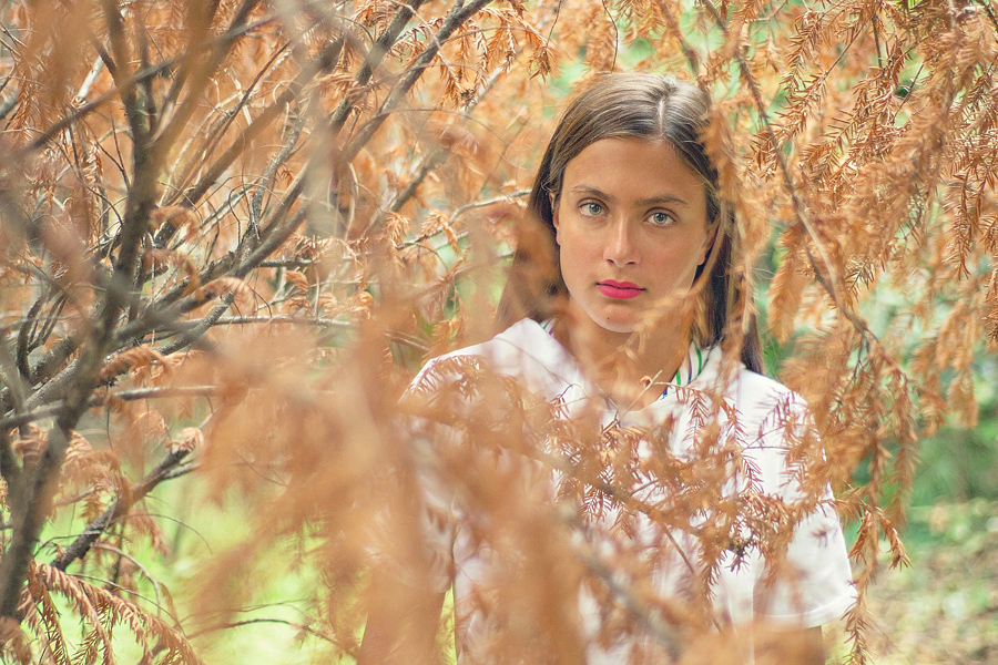 I rami e le foglie dai bei caldi colori autunnali che fanno da proscenio al viso e soprattutto agli occhi della bella fanciulla, talmente nitidi e luminosi che bucano il frame e arrivano dritti agli occhi dell'osservatore.