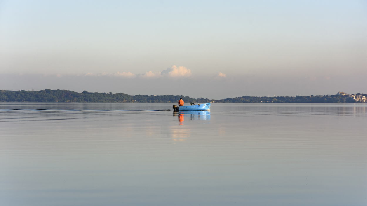 Bello il contrasto tonale dei vividi colori dell imbarcazione e del marinaio e i riflessi di questi sulla piattezza dell acqua che spiccano sull uniforme grigiore del tutto. A mio gusto personale avrei dato un taglio diverso, rispettando il suggerimento canonico dei terzi per quanto riguarda orizzonte e imbarcazione, sacrificando buona parte del piede e della parte destra dello scatto