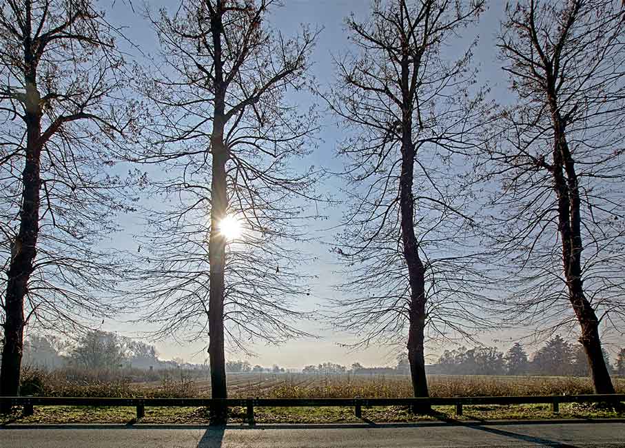 I 4 alberi fanno da barriera al Sole, oltre i quali la campagna corre verso l'infinito. Anche il Sole che buca l'albero, mi piace. Forse ci sarebbe voluto un passo indietro, per dare più spazio all'albero a sinistra e avere più simmetria.