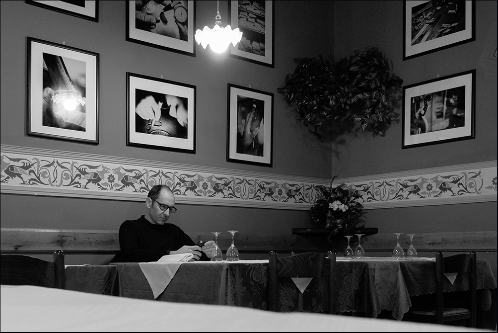 L'attesa in trattoria, e un solo coperto davanti al nostro protagonista. Evidentemente oggi pranza di fretta e da solo.. e allora : al posto del giornale, che si usava leggere, nella attesa, nella preistoria, ecco lo schermo del telefonino.