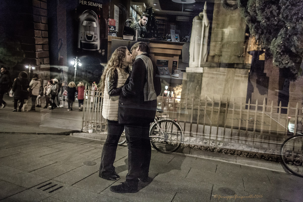 Se è stato un bacio lungo e passionale forse avevi il tempo di curare ancora meglio la ripresa. L'uomo che esce al margine sinistro, così come la ruota della bici che sbuca a destra disturbano un pochino: potresti eliminarli con un taglio adottando un diverso formato per la foto.
