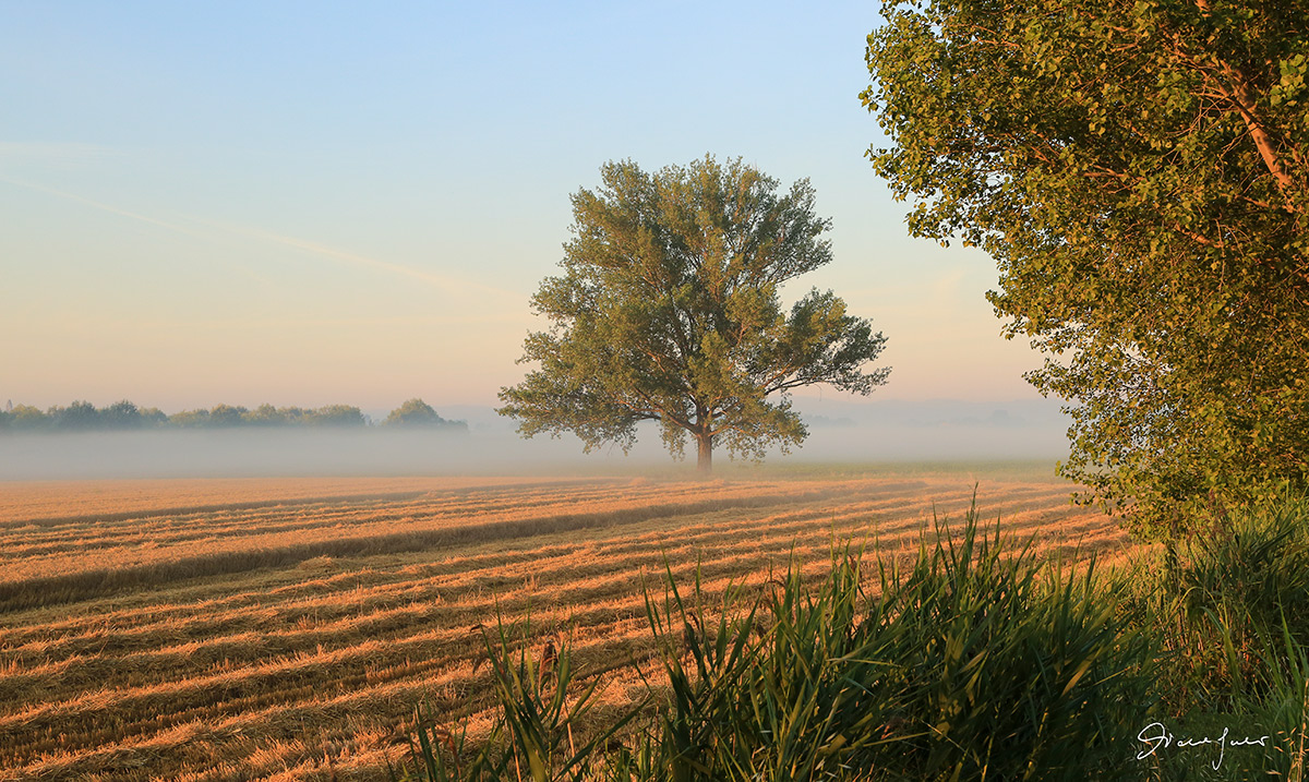 bellissima questa luce che inonda la terra arata in primo piano e che cattura subito lo sguardo per poi continuare verso la parte più lontana soffermandosi sulle cime degli alberi che emergono delicatamente dalla bellissima nebbiolina Ok! Ciao