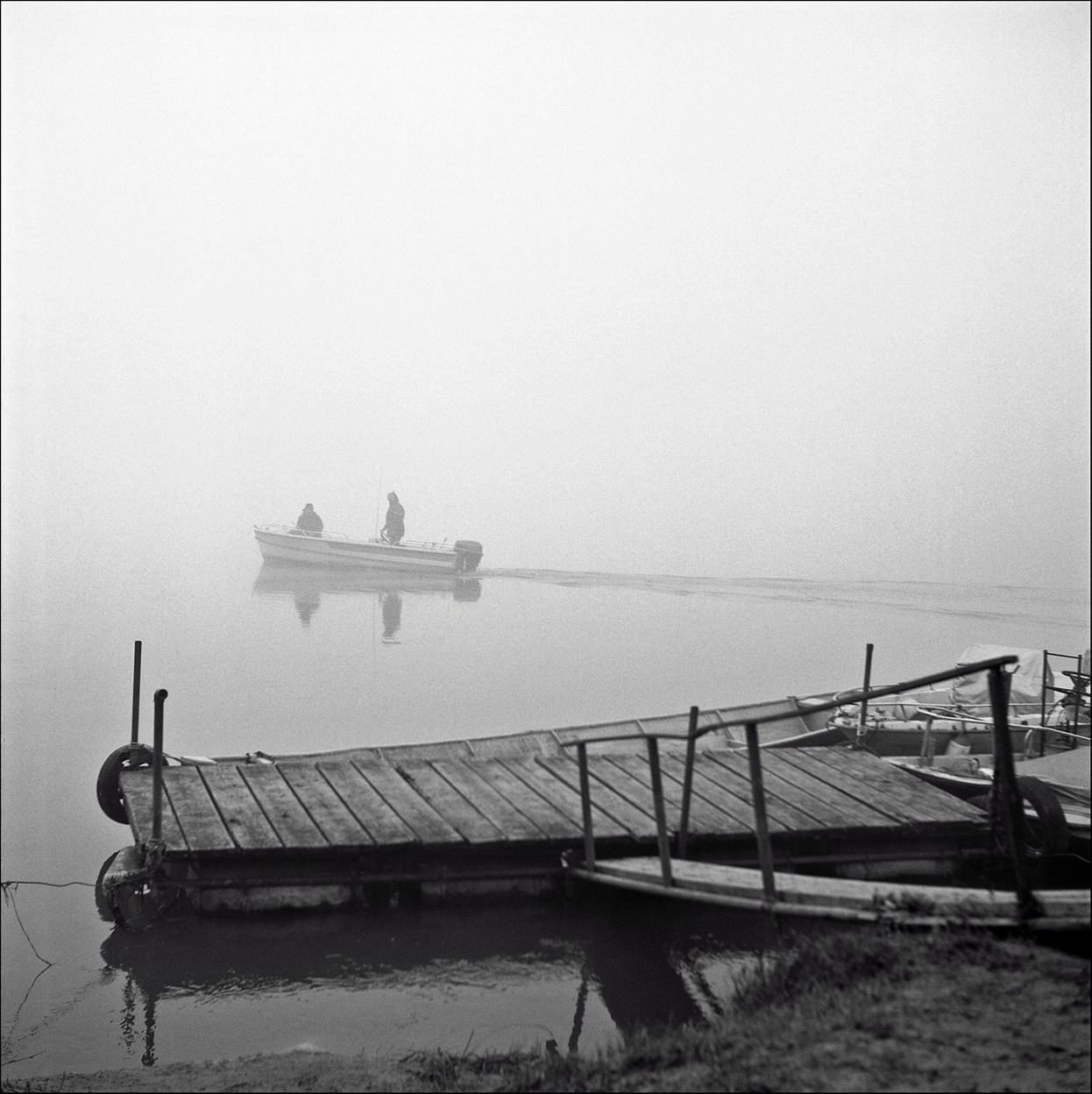vedi cara (Clara)... a volte (quasi sempre) la fotografia (mi) sorprende sempre... Con l'analogico poi è all'ordine del gg. Avevo appena scattato la foto al pontile; tutta perfettina (insomma... quantomeno a fuoco)! La giornata era pessima (qui nel lodigiano il sole manca da settimane) e la nebbia si tagliava con il coltello. Appena dopo lo scatto ho sentito il rumore del motore di una barca in avvicinamento con i due pescatori che la conducevano fischiettando. Ovviamente la vecchia Salyut senza esposimetro e con tutti i comandi (3 !!! fuoco/tempo/diaframma) manuali nn permettevano voli pindarici... sono risalito in fretta e furia più in alto sulla riva e ho scattato un attimo prima che la barchetta scomparisse nella bruma. Ho usato gli stessi parametri dello scatto precedente senza mettere a fuoco... ed è venuta così. Il bello (o il brutto ?!?!) della fotografia analogica... tornare a casa senza aver la certezza di come si è "lavorato"... ovviamente l'altro scatto, senza la barchetta, nn regge il confronto !