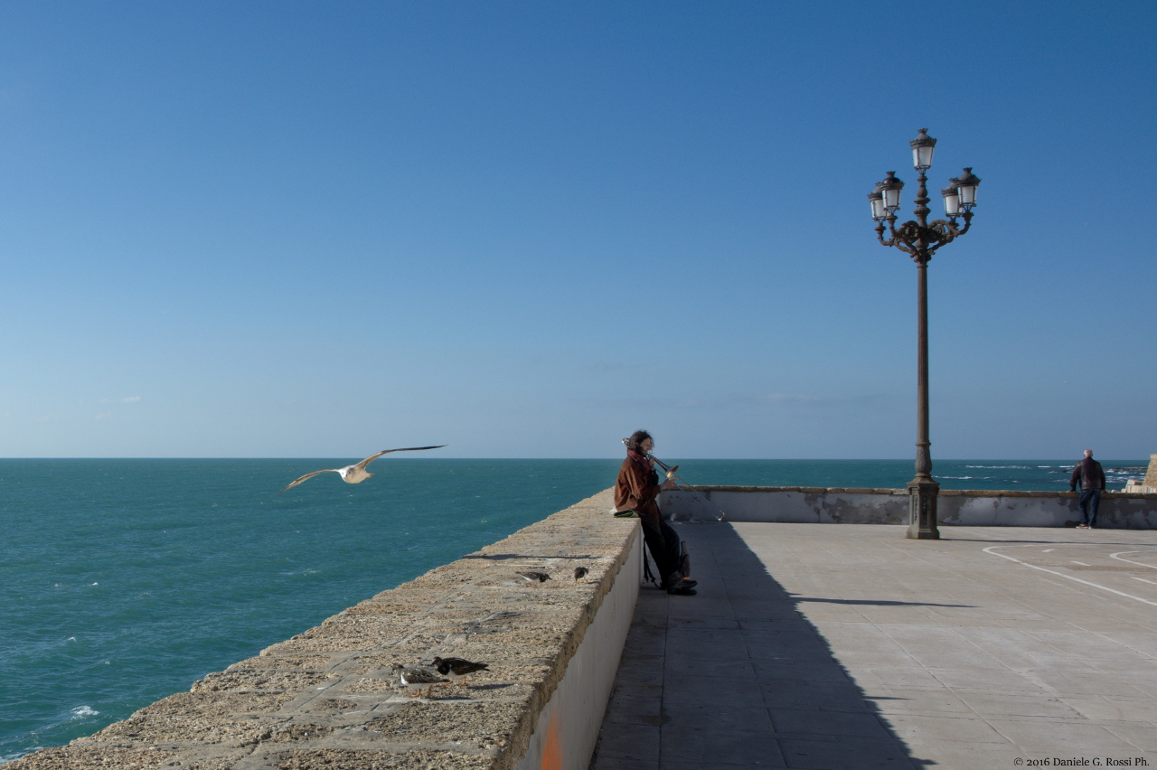 Per me un bel paesaggio abitato, a cui non manca un piccolo, piccolo, ma presente cuore Street. In queste luci nette e brillanti, entro linee geometriche interessanti , il ragazzo con l'ottone volge le spalle all'attimo fuggente di questo istante: il gabbiano in volo. il soggetto sorvola basso, in prospettiva quasi sfiora le sue spalle , segue idealmente la elodia inudibile dell' inconsapevole esecutore. Peccato che, per un nulla, il gabbiano non resti interamente contro il blu del mare, bensì strabordi un poco oltre la linea dell' orizzonte. In questo senso apprezzo di più il tuo scatto originale, che contestualizza e fa ben cogliere questa occasione.. musicale bella vista , ricca di ritmo e solarità.