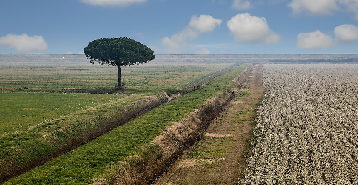 mi piace: nubi magrittiane, albero anche, buona sfilata prospettica e sullo sfondo quella nebbiolina sull'argine, che nasconde misteri ..