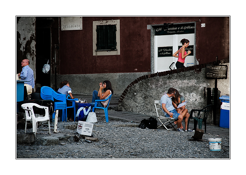 L'immagine colpisce per la su teatralità, tutte le figure eccetto una sono armonicamente presenti ma ognuna a sua volta potrebbe essere un'immagine a sè stante isolandola dal contesto o cancellando le altre figure lasciando tutto il frame. L'uomo a sx mi rompe un pò l'armonia, troppo a ridosso del bordo e col secchio blu che lo impalla un pò, capisco che il sesto serve a parafrasare il titolo, ma che dici di questa variante dove l'ho mandato a prendersi un caffè al bar? Very Happy Wink