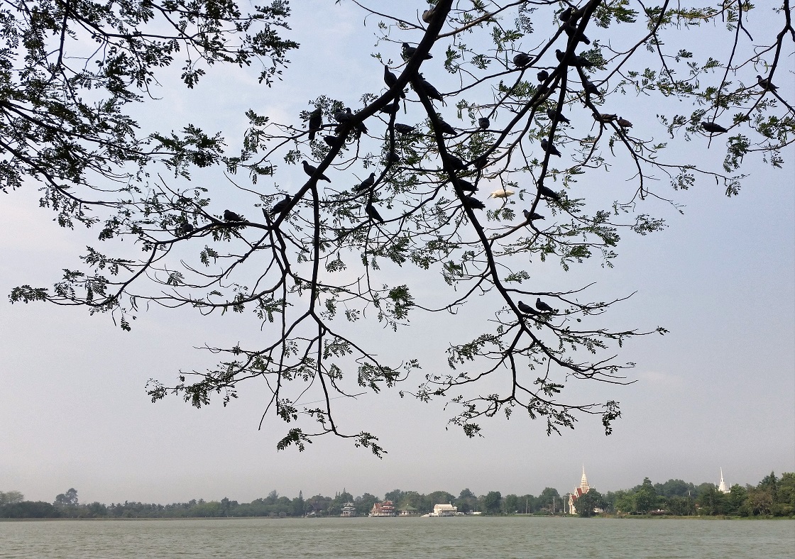 Un Tropico in un certo qual modo minimalista, meno vistosamente a caccia di colori accesi, che gioca con ricami vegetali su di un cielo omogeneo. Potrebbe essere una foto usuale, se non fosse che in secondo ti accorgi delle foglie che tali non sono, delle presenze alate in nero ,fra cui spicca l'ospite in bianco. E il profilo di terra oltre l'acqua racconta di guglie speciali e di una terra lontana.