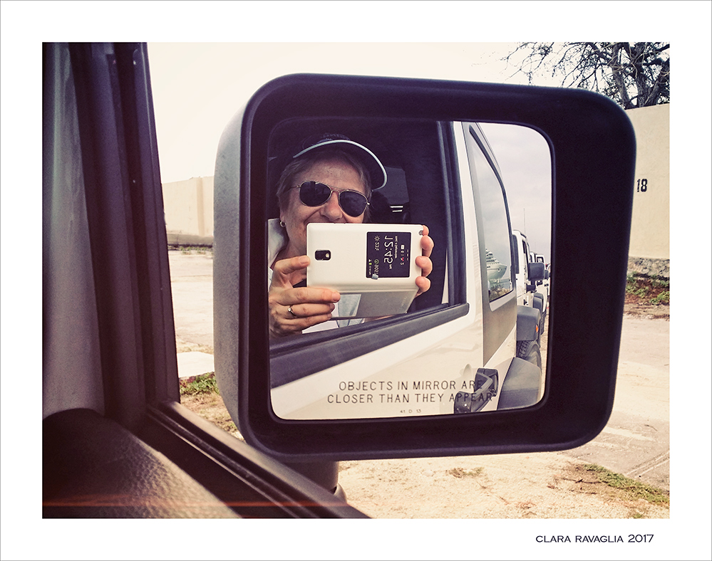 Erano una fila di jeep nuovissime ( le vedi nel restrovisore) con cui ci saremmo recati, guidando in proprio, all'imbarcadero per isla Passion