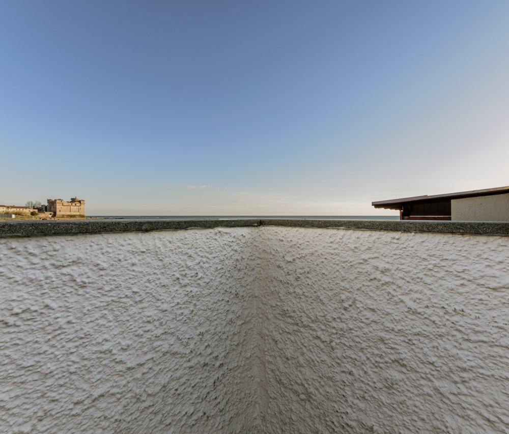 Un muretto che diventa una lunga strada che accompagna lo sguardo verso il mare all'orizzonte. Un sapiente uso della prospettiva.