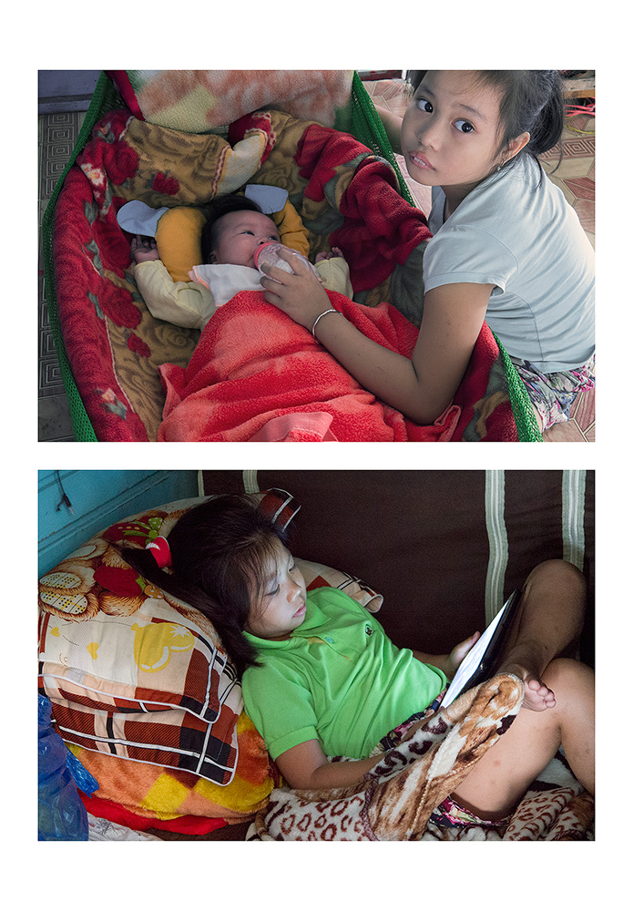Ragazzine che si occupano delle sorelle più piccole, mentre leggono però con voracità nel loro tablet, un senso di sacralità rituale che si trova però ogni volta, anche dissacrata, nella esposizione dei merci e cibi di consumo, altari di preghiera che ,fra un gesto spirituale e una foto al volo, lasciano e entrare la ingenuità di un cagnetto arzillo. Il rosso politichese che fa capolino in sigle e bandiere, accanto alla dignità speciale di un volto maschile ,la quotidianità dei mercati e dei negozi, fra molteplici oggetti che cercano il gusto occidentale mentre perdono quello più locale.. Stupende tutte le seguenti: prima fra tutte la ripresa dell'omino che spinge la fiala di abiti nel carrello appendivesti , fra palazzi diroccati e tubature che dovrebbero portale allacciamenti moderni , ancor in forse...