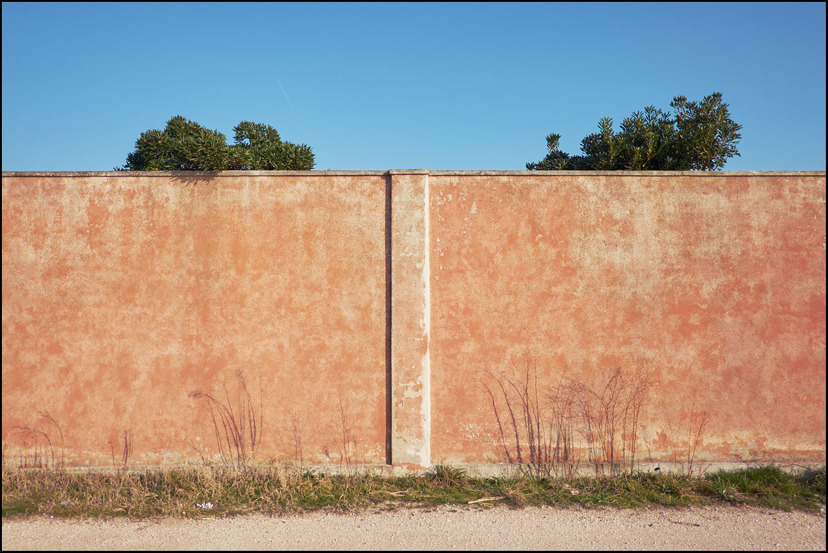 Semplice ma efficace la composizione, un muro spatolato dal quale fanno capolino due piante. Determinante la presenza della colonna, che divide il muro in due.