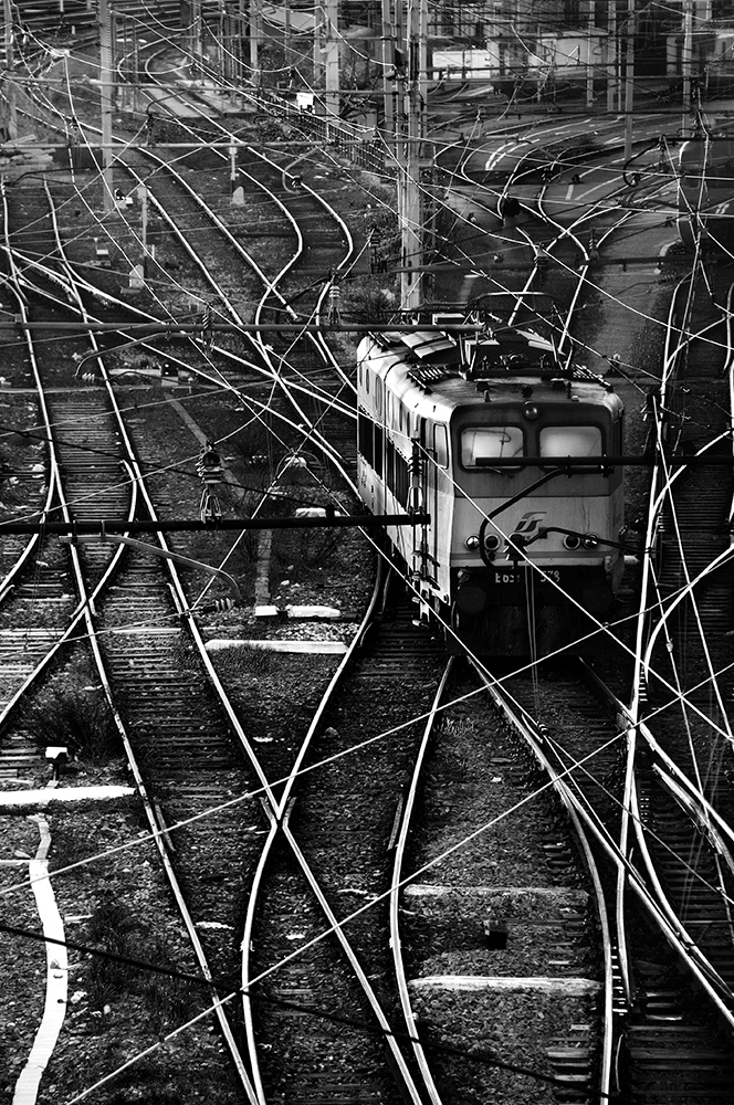 Grande bn e luce per questa spettacolare immagine dove punto di ripresa e focale hanno contribuito ad intrappolare il locomotore in una fitta rete di cavi e rotaie.Complimenti e preferita! Ciao