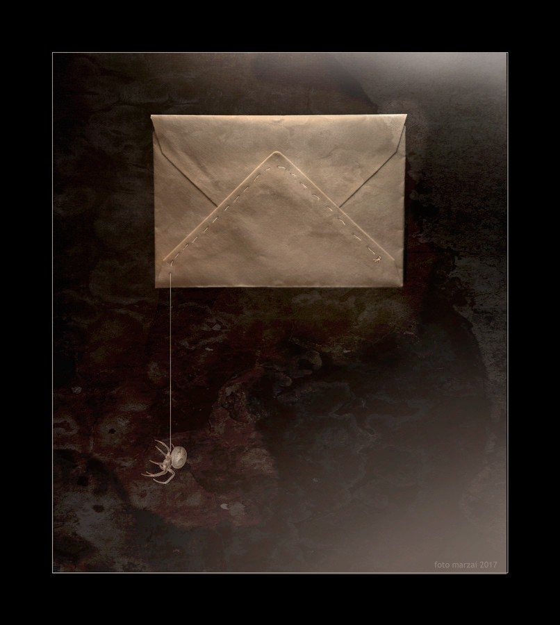 Immagine ottimamente realizzata come idea,cromatismi e composizione.Il sottile filo del ragno,forse la speranza più forte di qualsiasi catena,tiene sigillata questa busta che può contenere il nostro destino.Non ce la faremo mai ad aprirla.Bella!  _________________ Sergio Demitri https://www.flickr.com/photos/124946035@N02/ |
