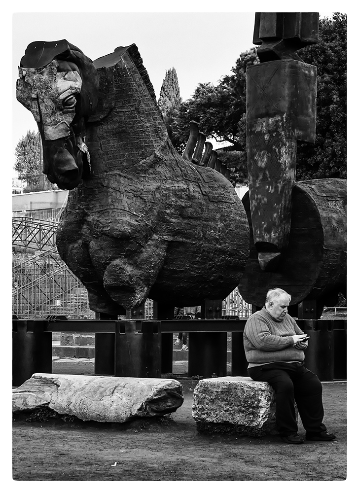 Trovo che sia una fotografia meritevole, una figura singolare su uno sfondo a tema, magari meno inusuale il gesto del soggetto, cioè ripreso nell'atto di sfogliare il suo smart però si presta, grazie a una location interessante: un moderno Ulisse che cerca in rete consigli per ''entrarci'' in quel cavallo oppure un pdf per rimontarlo, ispira visioni ironiche (ma non cattive) per cui riuscita secondo me.  _________________ Dieci fotografi davanti allo stesso soggetto, producono dieci immagini diverse,
