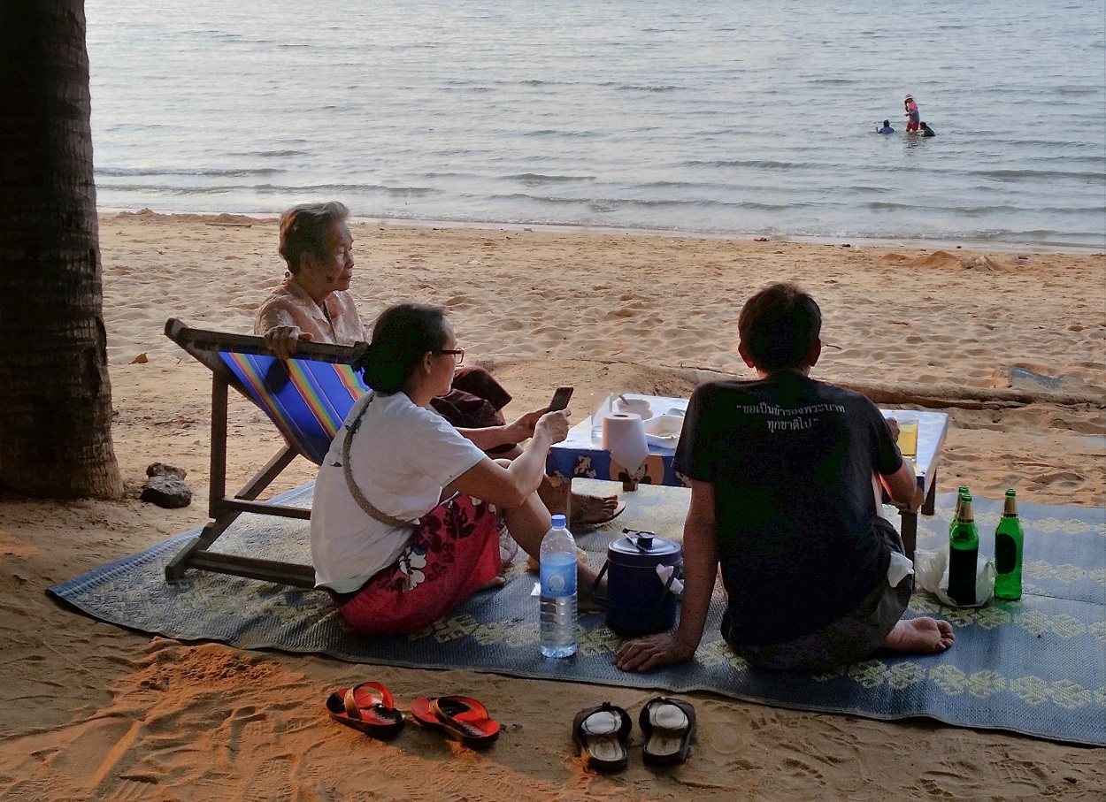 Mi piace questa immagine familiare che mi riporta a ricordi giovanili quando i nonni tramandavano le storie di famiglia,davano consigli ed erano considerati non soltanto un bancomat.Se la signora di centro porta bene i suoi anni ed il ragazzo male il tris generazionale c'è.A proposito,tre come il numero dei bagnanti.Bella luce ed ottimi colori. Ciao