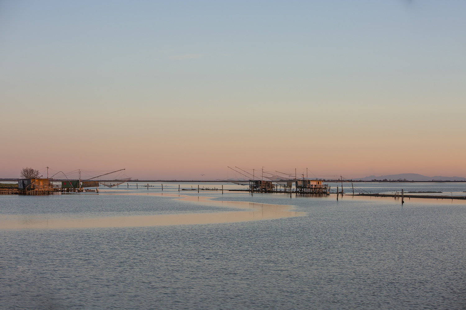 Molto belle le tonalità e ben reso il dettaglio, pur nella piccolrezza relativa delle costruzioni da pesca e dello sfondo. Scelta stilistica dell'orizzonte centrale motivata , dato che sostiene esattamente la presenza della lunga fila delle reti e capanni. Per me, per il cielo così vasto e omogeneo, si presterebbe anche ad un taglio molto più panoramico, che risulterebbe altrettanto armonico e valorizzante.