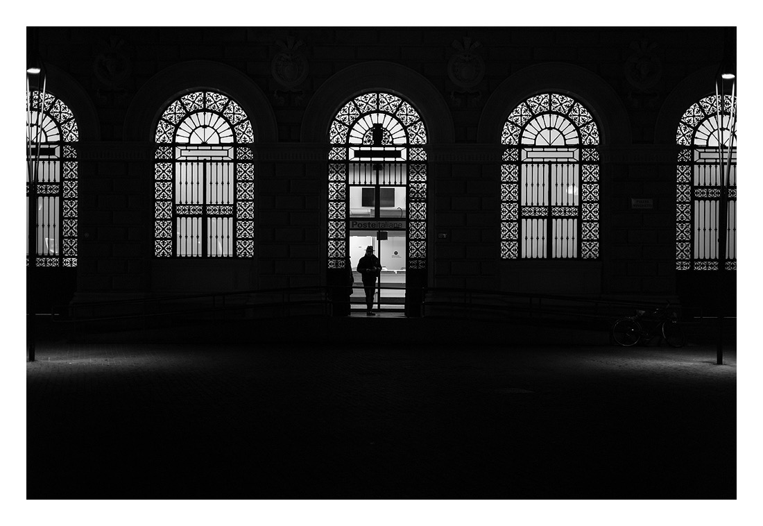 Molto gradevole e di impatto , un b/n che sa il fatto suo. Luci ed ombre ben catturate a dare enfasi all'intero fotogramma e far vedere in parte quello che l'occhio inesauribilmente tenta di cercare per poi trovare, come ad esempio quella bicicletta ingoiata dall'oscurità . Tutto perfetto, avrei clonato la scritta Poste italiane e la persona a sx che sbuca solo in parte accanto all'uomo ... ma queste sono solo mie fisime PS l'avrei vista bene in Varie