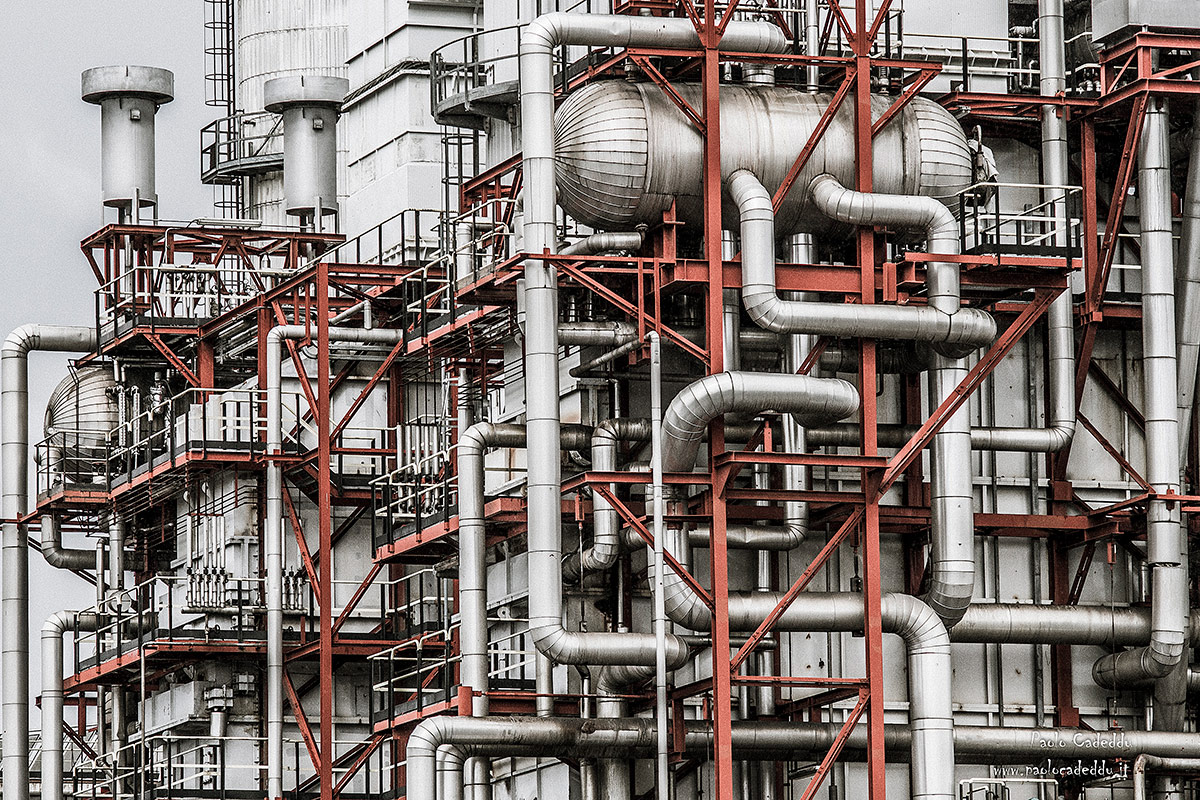 Il soggetto è molto bello e a colori rende molto. La foto va raddrizzata: su questo non ci sono dubbi. La luce direi che era di quelle buone per disegnare bene le forme senza rendere troppo gravi, pesanti le ombre. Per me è un po' dispersiva: il groviglio di tubi e impalcati si stempera nella sensazione di guardare una tessitura più che un' architettura industriale. La parte centrale, dove c' è quel serbatoio orizzontale, estesa un po' ai lati mi pare invece la parte migliore. Prendendomi una licenza a proposito dei rapporti canonici tra i lati, ti allego la demo di quel che intendo (è bianconero).