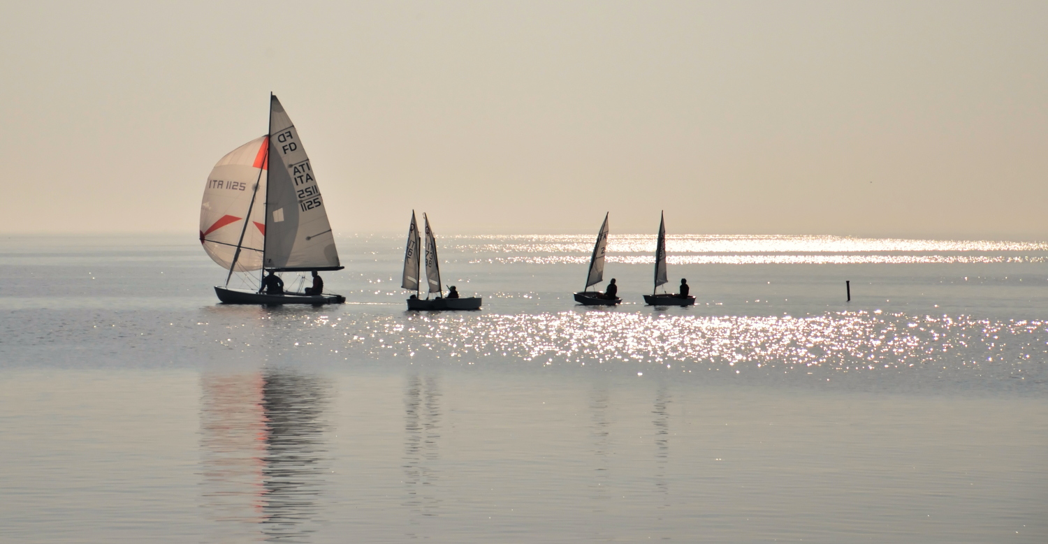 Molto bella questa mini regatina in controluce, splendidamente immerse in tonalità calde e dorate. Solo un piccolissimo appunto per il riflesso forse un po troppo a pelo sul bordo inferiore (se non addirittura tagliato) delle imbarcazioni Ok!