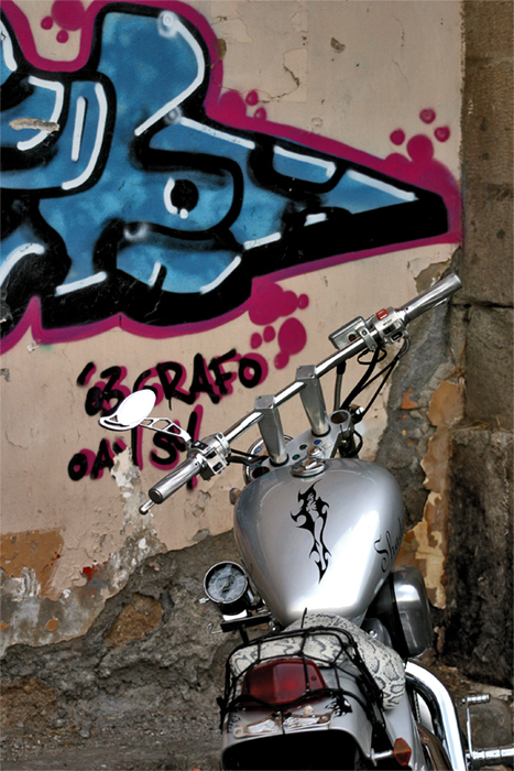 Magari il solo graffito preso frontalmente e il manubrio e serbatoio sovrapposto allo stesso magari con un po di compressione data dal tele......