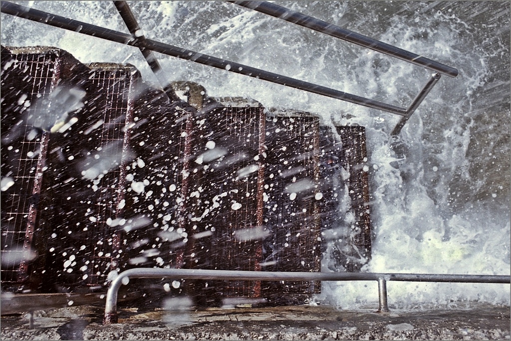Una foto che metto subito fra le preferite. Intensa e anche un poco straniante. Pensa anche, al primo sguardo, avevo pensato ad uno sfondo di palazzine dalle tinte dense e brune, dal sapore desaturato, colte attraverso un vetrata colpita dall'acqua di un acquazzone. Poi naturalmente noti e metti al loro posto le due ringhiere di acciaio, interpreti la direzione alto basso della inquadratura e identifichi i gradini, e ti abbandoni alla spuma travolgente e impetuosa che bagna lo scatto . Dinamica, energetica, e immersiva come poche.